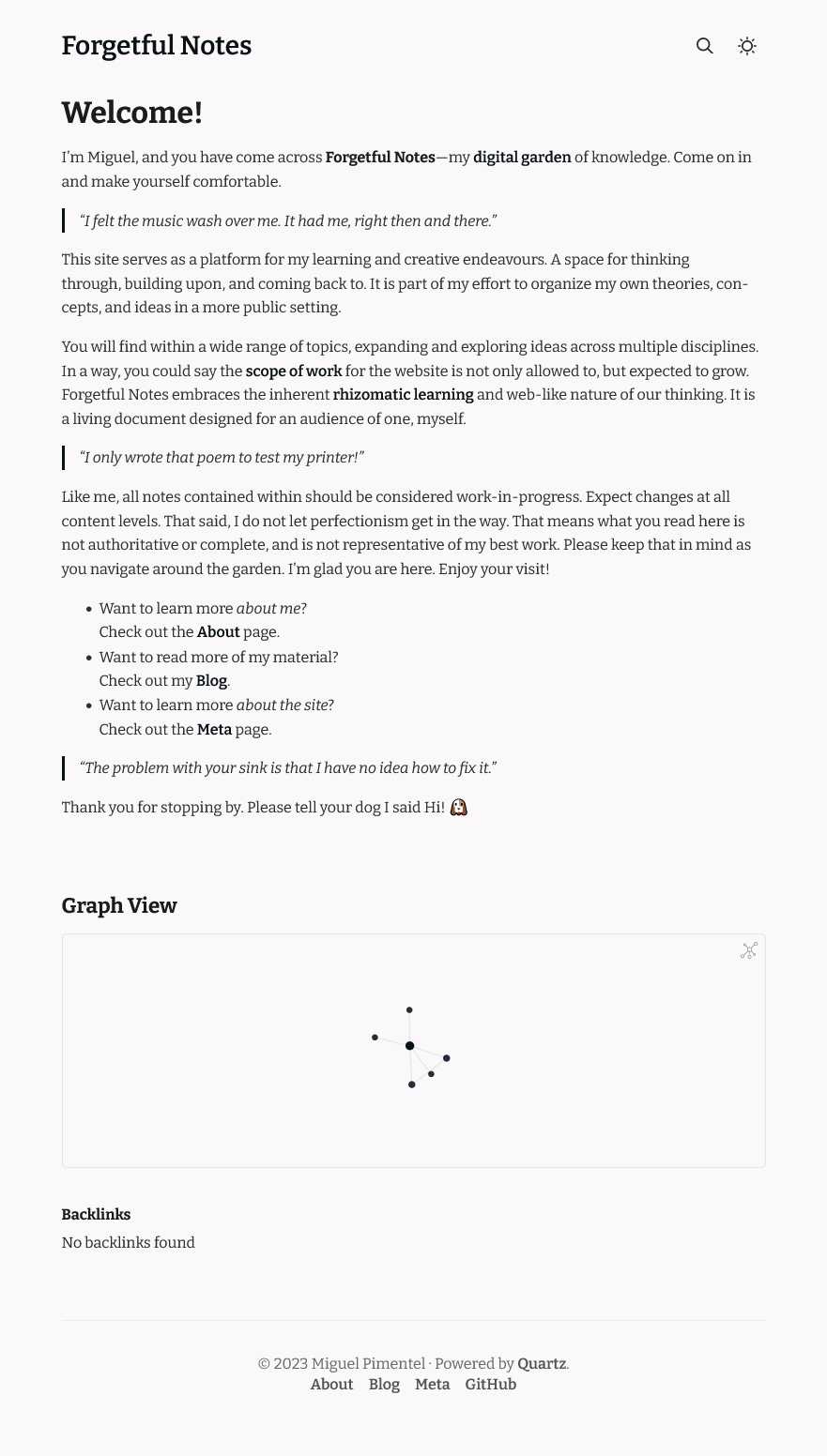 This repository holds the source code for Forgetful Notes—my digital garden of knowledge. It serves as a platform for my learning and creative endeavours. A space for thinking through, building upon, and coming back to.